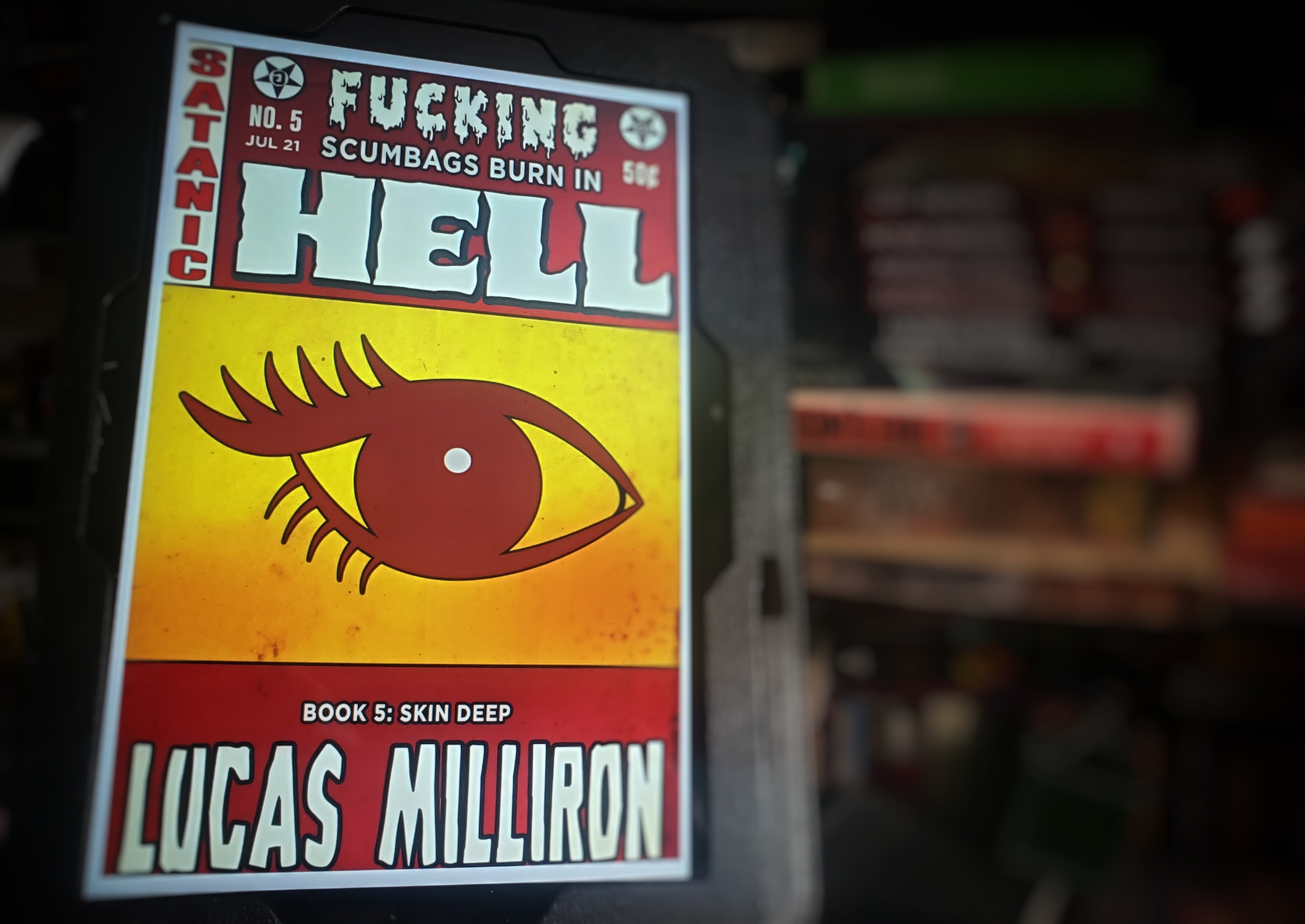 Skin Deep feels like the answer to the unanswered question, “What if Nip/Tuck had included an absolute sociopath as a protagonist?” Lucas Milliron expertly answers that question by crafting a narrative that showcases both the depravity and evil of Mike’s character but also the vulnerability and fear that serves as the substrate of who he’s become. The random glimpses into a horrifying childhood make it almost impossible to write Mike off as a two-dimensional piece of shit caricature. However, no amount of childhood trauma and abuse can make his actions throughout the story palatable or justified, and a reader can’t help but wish for Hooper to come along. Milliron brings a different style to the Hoopiverse. He provides the reader with a frenetic, hallucinatory barrage of set pieces that manage to be simultaneously jarring and free-flowing. At no point does the reader see around the corner to what the next scene brings to the table, and that adds to the bewildering nature of this installment of the series. As someone who can’t bear to have objects in/near my eyes, there was something viscerally unsettling about different aspects of this story.