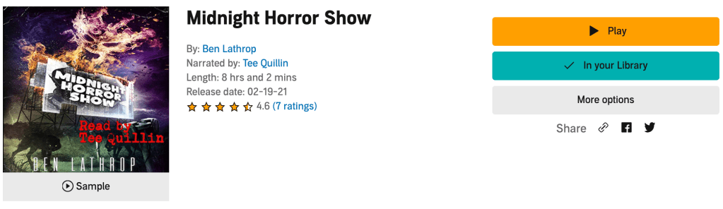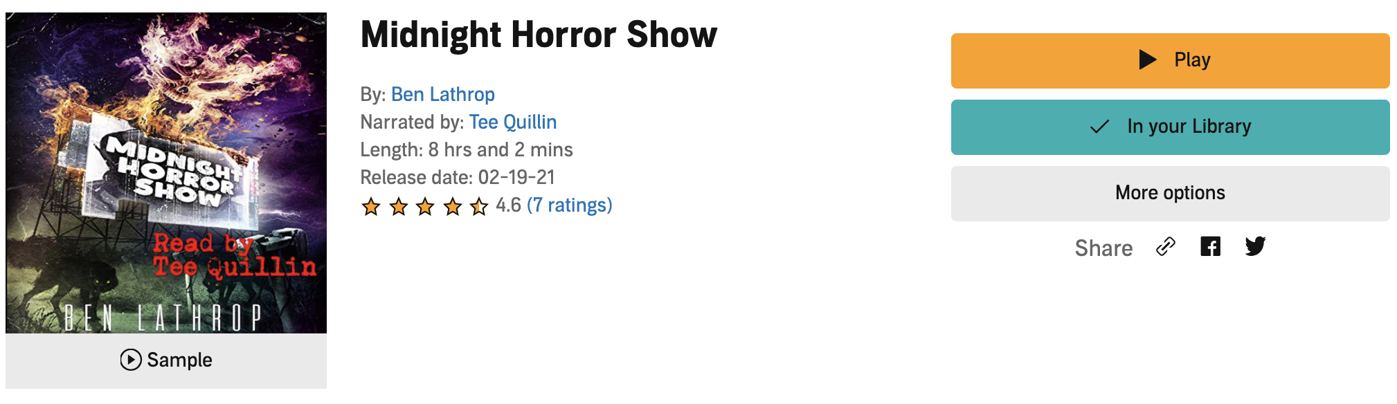 A little backstory might be in order for this review. This story is built around the old Screen Gems release of Universal horror pictures in syndication to television stations in the late 1950s. With the encouragement that the stations bring in a host to introduce the “Shock” and later “Son of Shock” pictures, Screen Gems helped to platform an industry, first popularized by Vampira, the original horror host on television. There have been many others along the way, including notable icons such as Vincent Price, Joe Bob Briggs, and Elvira. Midnight Horror Show captures a nostalgic snapshot of a time that’s lost in memory, turning it into something truly sinister, and telling a fantastic tale along the way. With a series of unusual killings in the sleepy Iowa town of Dubois in 1985, Detective David Carlson finds himself thrust into the midst of an all-too-real horror show. Investigating the seemingly unrelated crimes, he encounters James West, a strange young man with a fixation on horror and heavy metal, soon to host his own horror show at a local drive-in with a dark history. James’s obsession with a former television and drive-in host, Boris Orlof, brings Detective Carlson face-to-face with secrets and terrifying truths previously buried in the past. Confronting his own forgotten memories, a file of missing person cases from twenty years before, and the very real possibility that there’s more than simple movie magic taking place behind the scenes, Detective West finds himself fighting a ticking clock to solve the unbelievable mystery and save the young man he’s grudgingly befriended before Halloween night. Midnight Horror Show is a captivating story that leaves you guessing what’s going to happen right up until the end. When you think you have a handle on what’s next, Lathrop manages to dodge your assumptions and veer off in a different direction. The narration provided by Tee Quillin is fantastic and believable as he voices the assorted characters populating the tale with seeming ease.
