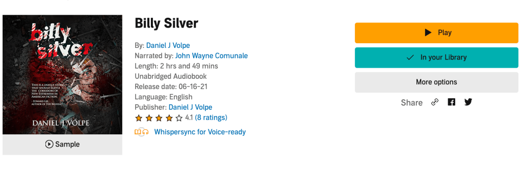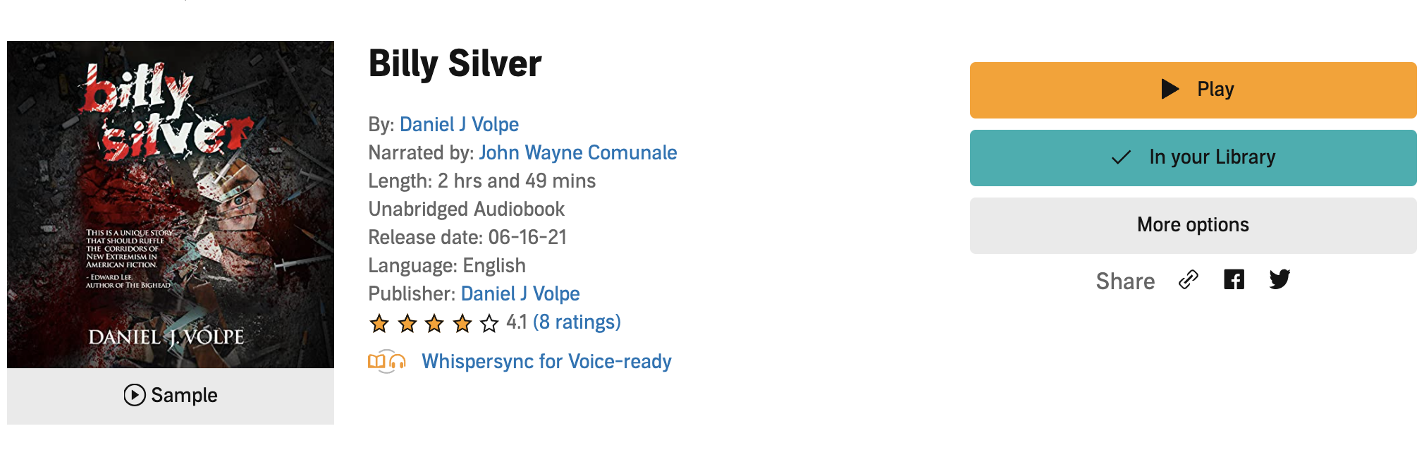 Billy and Jeannie are definitely not Jack and Diane. They’re not the sort of couple Mellencamp would immortalize in song. It’s more likely they’d be immortalized by a band like Cannibal Corpse, preferably before the departure of Chris Barnes. Billy Silver is a junkie and an alcoholic, a guitarist and singer, and an all-around degenerate. Despite all of his flaws, and there are many, he’s also captivating and occasionally funny. Within the first few pages, you’ll come to loathe him. That sensation never quite disappears, even as you begin to feel a small amount of sympathy for him along the way. With his life falling apart even worse than it already had, Billy finds his way into a tattoo parlor where the mysterious Talia pays him to obtain a new piece of ink under the pretense of needing practice before the shop officially opens. It doesn’t take long before Billy’s self-destructive nature takes on an altogether more horrific and direct manifestation. Daniel Volpe captures Billy and the other characters who populate his dingy, filth-riddled corner of existence with such detail that you can almost smell the halitosis and urine as the story carries you along. Volpe brings the streets and back alleys of the city to life in crushing, grimy detail that is further enhanced by the narration provided by John Wayne Comunale. These two men together provide us with something as splendid as it is awful. I’m glad I’ve snagged more audiobooks narrated by Comunale because he is not only an excellent writer but a truly amazing narrator.