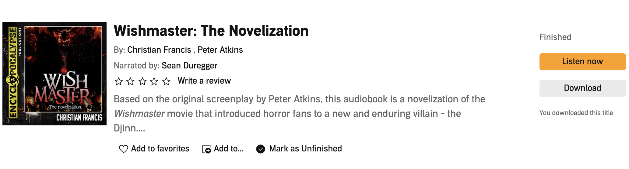 Wishmaster: The Novelization by Christian Francis, Narrated by Sean Duregger