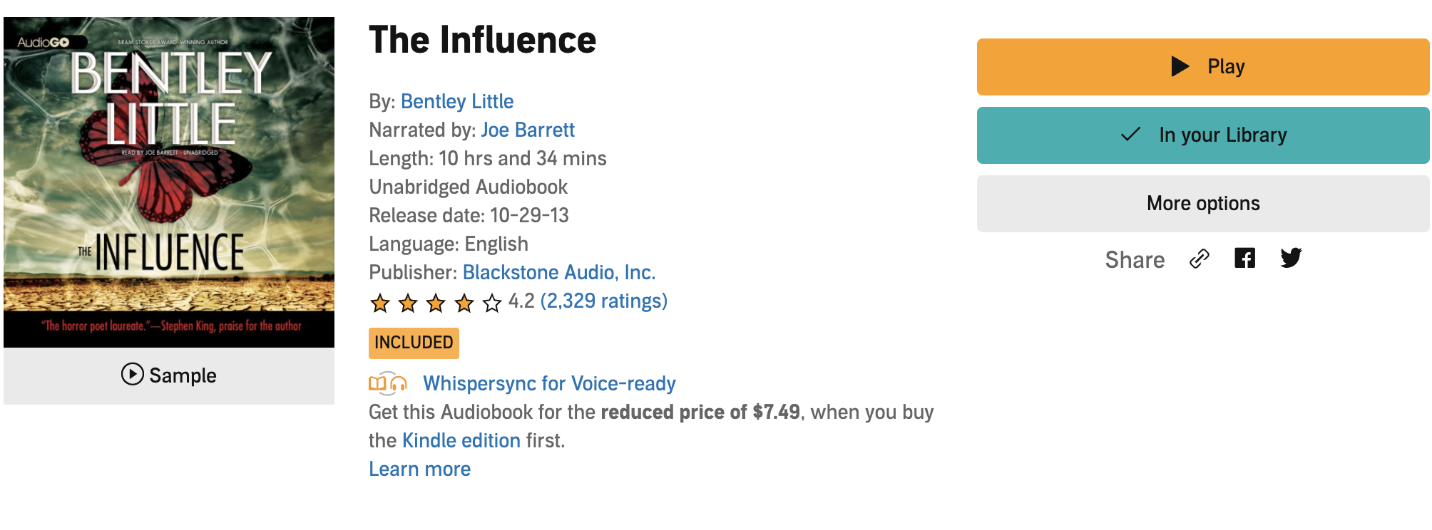 While this isn’t the best of Bentley Little’s work, it is as deeply unsettling and imaginative as anything else he’s written. Elements of body horror and psychological horror meld perfectly with supernatural and spiritual elements to create a narrative that demands the reader/listener not turn away.