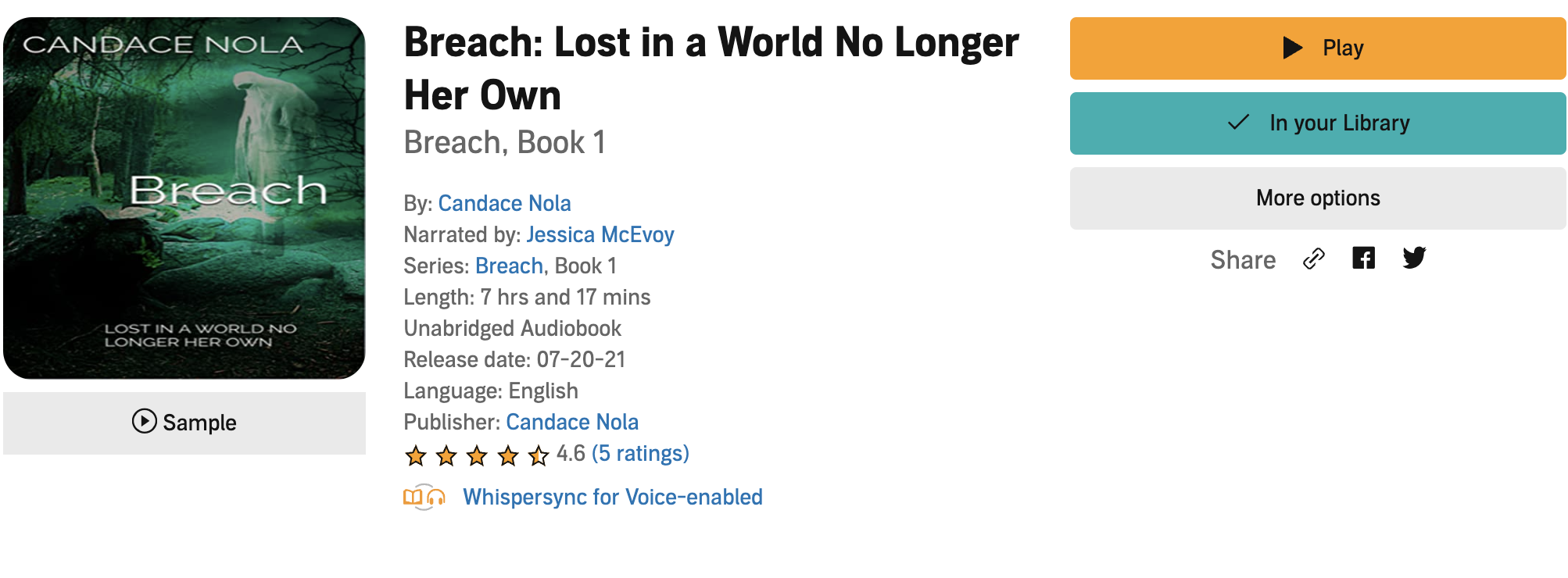 Candace Nola’s Breach drags us along with Laraya Jamison into a disorienting and terrifying battle for survival in a world alien from our own. The gradual revelation of a world that feels as fantastic and dreamlike as it is sinister and dangerous is a thrilling adventure for readers/listeners, even as beleaguered Laraya struggles to learn the rules of this new world and means to find her way home.