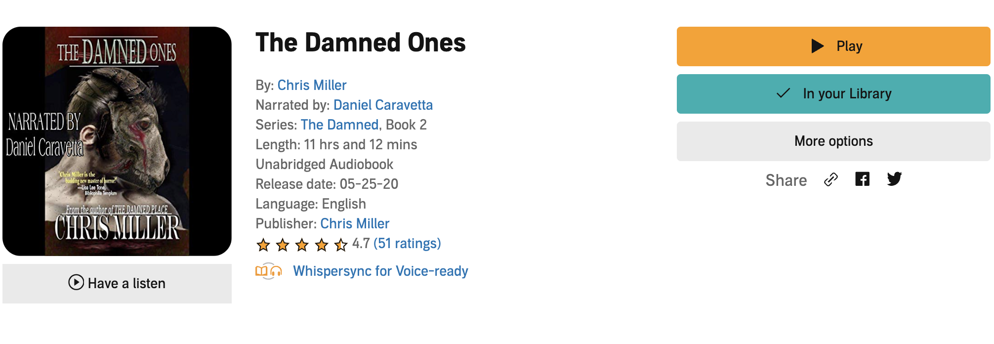 The Damned Ones picks up the threads left behind by The Damned Place 26 years after the horrific conclusion in the forest outside of Winnsboro, TX. The four children have grown up and gone their separate ways, largely relegating the memories of that fateful–and fatal–day to their nightmares. And while they’ve mostly forced themselves to forget what happened, believing it to be a thing of the past, The Glutton has not forgotten, and neither has Jake Reese, still trapped in the dying world where Jim Dalton had left him. When a woman disappears, and her distraught mother calls the police, it’s Chief Jim Dalton who answers the call. Signs of violence point toward something awful happening in the woman’s apartment, and it’s only the first of many terrible disappearances to plague Winnsboro, all having something to do with Norman Reese, Jake’s younger brother. No less mad, and driven by religious fervor and the pressure of a tumor in his brain, Norman might be precisely what The Glutton needs to force his way into our world. Jim, Honey, Ryan, and Freddie must come together again to face the monster they hoped they’d left in another world before our world becomes a desolate and dying place as well. Chris Miller raises the stakes and ramps up the violence for his follow-up to The Damned Place, pulling no punches as he lays out the welcome mat for The Glutton to join us in rural Texas. Mysterious disappearances and secrets from the past have managed to fester long enough that the abscess on the edge of our universe has no choice but to burst and fill our world with its infected burden. Daniel Caravetta again provides excellent narration for the audiobook, following the children seamlessly into adulthood and bringing their deeply embedded trauma to life. Norman’s harsh and nasal shrieking dialogue was exceptional, and stood out as a high point in the narration.