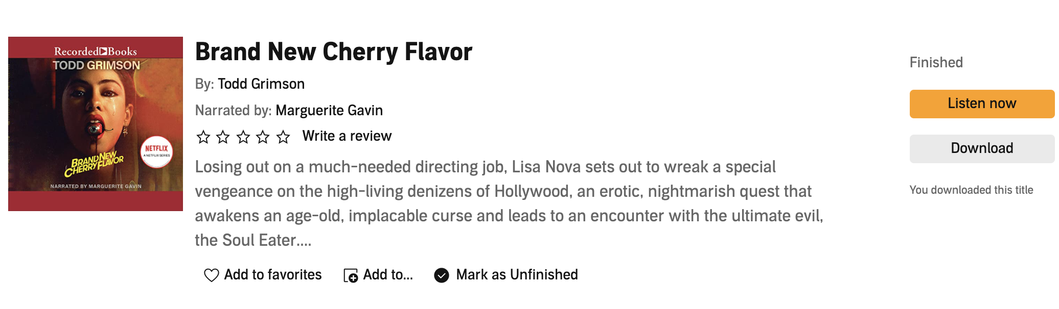 Brand New Cherry Flavor is a book packed with originality and uniqueness. There’s a potential within this story, a barely suppressed tension and horror seething just below the surface, that sadly never quite reaches fruition. My comment on wasted potential is not to suggest I didn’t enjoy the story because it was surprisingly enjoyable. I feel almost as though the lack of gratification or fulfillment was an intentional stroke by the author. Consider it a page from the Bret Easton Ellis playbook, metafictional and intentionally subverting the expectation of the readers. Lisa Nova is, for the most part, not a likable character. Throughout the narrative, she fluctuates between appearing vapid and slyly witty while perpetually coming across as shallow. Being unlikeable does not, however, make her unsympathetic. Witnessing as her life spins out of control with an increasing cost in collateral damage, it would be challenging to dismiss her plight. We join the tale just as Lisa’s passed over for a promised role as the Assistant Director on a major film project. This position had been promised to her by Lou Burke, the man she’d been having an affair with up until that point. As a concession, her now-former lover sends her to meet with people who will capitalize on her looks by paying her to star in a pornography adjacent film. Lou Burke, or as Lisa repeatedly refers to him, “Lou Greenwood, Lou Adolph, Lou Burke,” is a class act. He deserves to have a fork stabbed into his leg. Incensed, and seeking revenge, Lisa goes to her ex-boyfriend, Code, to inquire about a hitman she’d heard about through him. This leads her to Boro, and the rest of the story evolves in its phantasmagoric way from that interaction. Traveling from Hollywood to Brazil, from Brazil to New York, and from New York back to Hollywood, Lisa discovers that Boro has not only taken the job of destroying Lou Burke–and his family–but is also providing Lisa with the power to shape the world around her in ways many people could only dream of. Psychic tattoos, a mythological white jaguar, zombies (of the voodoo variety), drugs of all flavors and varieties, magical filmmaking, mirrors that show the past, and a garden of human limbs are only some of the more bizarre elements of this story. Though I enjoyed this book a good deal less than I would have liked, I can certainly understand the appeal it has for other readers/listeners. The audiobook narration supplied by Marguerite Gavin made the story more enjoyable than it might have been without such a competent narrator. She certainly managed to fully convey the character of Lisa Nova better than I think many narrators could.
