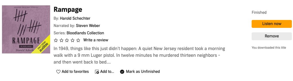 Rampage is the story of Howard Unruh, a man who, in 1949, would murder thirteen of his neighbors (and people passing through his neighborhood) before returning to his apartment and returning to bed because he’d run out of ammunition. As the killer himself indicated during an interview, he’d have killed a thousand if he’d had sufficient ammunition. Repressed homosexuality, experiences during the conflict of WWII, and assorted petty grievances against his neighbors simmered for years until finally exploding in a cold, meticulous series of killings that would thoroughly destroy the relative peace of Camden, NJ. Considered the face of modern mass murder, Unruh had no apparent interest in committing suicide at the end of his bloody rampage, nor any plan to be killed by the police. He simply wanted to kill the people he perceived as being aligned against him or of having committed one slight or another, and once Unruh started, he didn’t seem interested in stopping until he had no choice but to do so. The descriptions of the murderer’s flat affect and calm demeanor both during the rampage and during the subsequent questioning, while a bullet remained lodged in his thigh, were unnerving in a way I can’t quite put into words. Steven Weber’s narration was as high quality as it has been for the rest of the Bloodlands stories, and I would love to hear him narrating further true crime audiobooks and even documentaries.